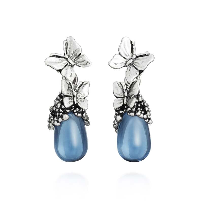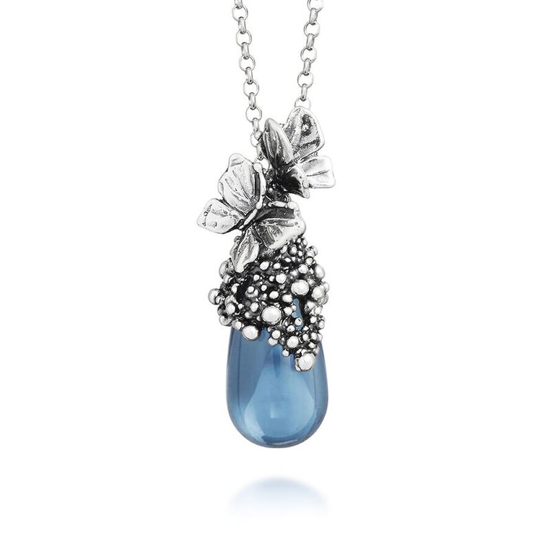Het Butterfly Drop collier combineert een cyaanblauw druppelvormig kristal met verfijnd zilverwerk, vervaardigd via de traditionele cire perdue-techniek. De sterling zilveren jasseron ketting is 45 cm lang en benadrukt het vakmanschap uit Italië.