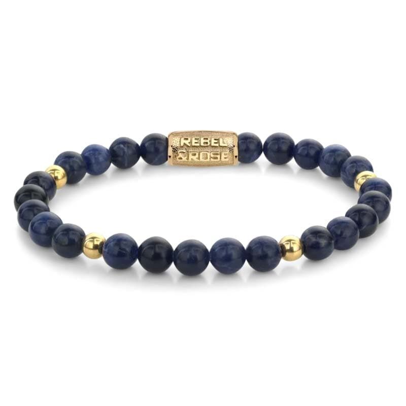De Rebel & Rose Bead rekarmband Midnight Blue - yellow ionplated - 6mm combineert de diepe, natuurlijke tinten van blauwe sodaliet met luxe gouden accenten. Deze handgemaakte armband uit de Bracelets Beads collectie straalt elegantie en vakmanschap uit. De 6mm kralen zijn zorgvuldig geselecteerd voor hun rijke blauwe kleur, die prachtig contrasteert met de gele ion-plated edelstalen kralen.