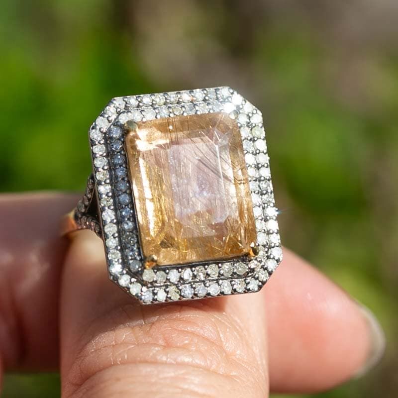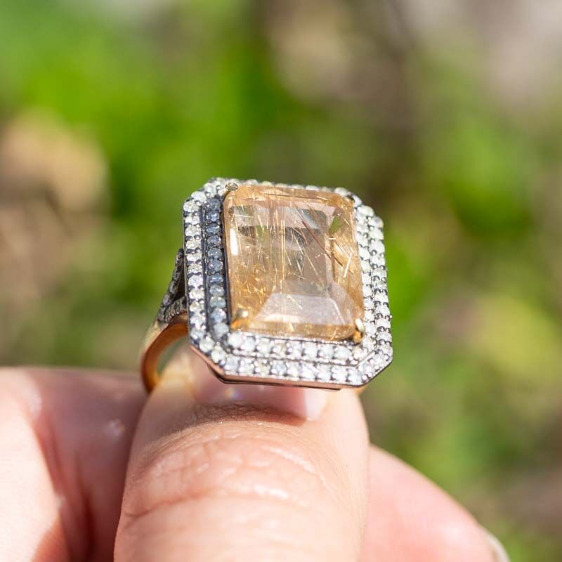 De scheen van de ring is gemaakt van 14 karaat goud, wat zorgt voor een warme en luxueuze uitstraling. De indrukwekkende rechthoekig geslepen rutielkwarts heeft een gewicht van maar liefst 17.8 karaat en bevat fascinerende goudkleurige naalden die het licht op magische wijze vangen.