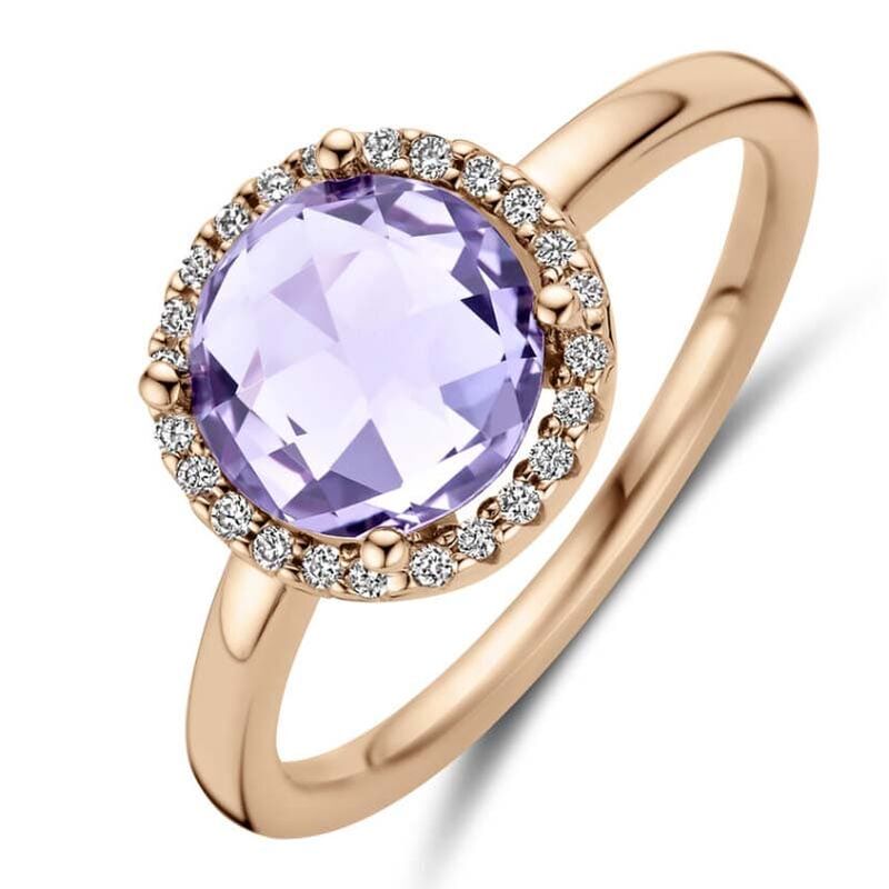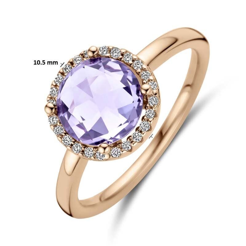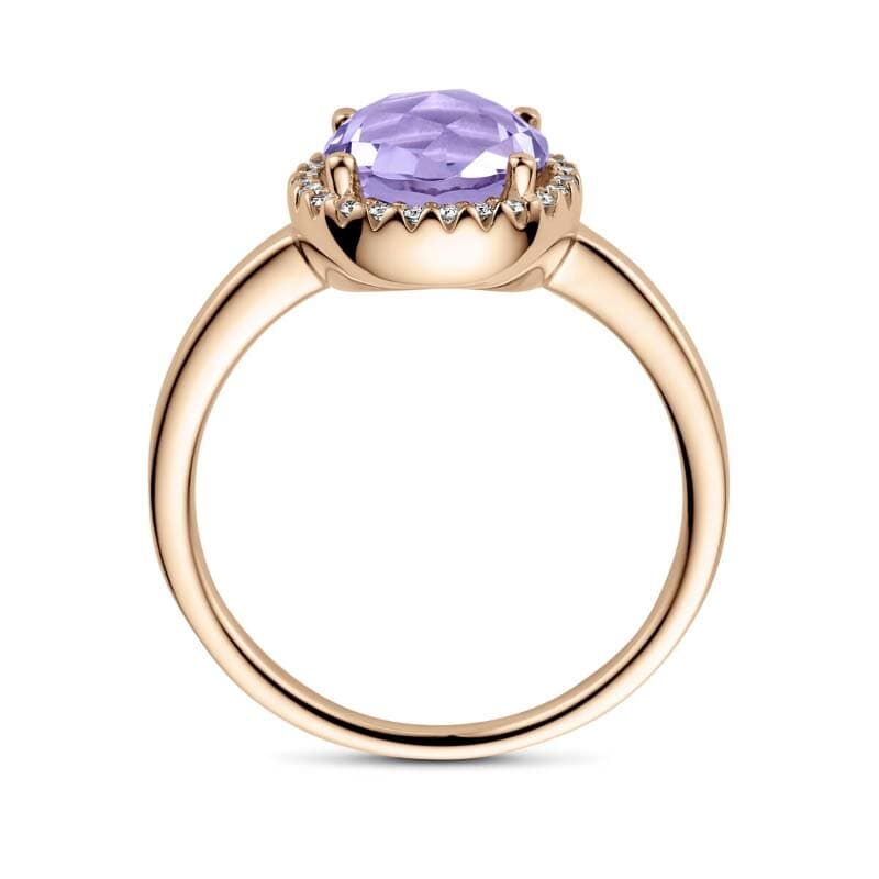 Laat u betoveren door de zachte schoonheid van deze 14k roségouden ring, waar een prachtige briolette geslepen amethist van 8 mm in een rijke paarse tint de show steelt. De steen wordt subtiel omlijst door sprankelende briljant geslepen diamanten met een totaal gewicht van 0.09 ct, met een heldere H-kleur (wit). De diamanten zijn zorgvuldig geplaatst in een chaton 4-poots zetting, wat de ring een elegante en verfijnde uitstraling geeft. Met een breedte van 10.5 mm en een gepolijste afwerking is dit sieraad een perfecte combinatie van modern design en tijdloze klasse.