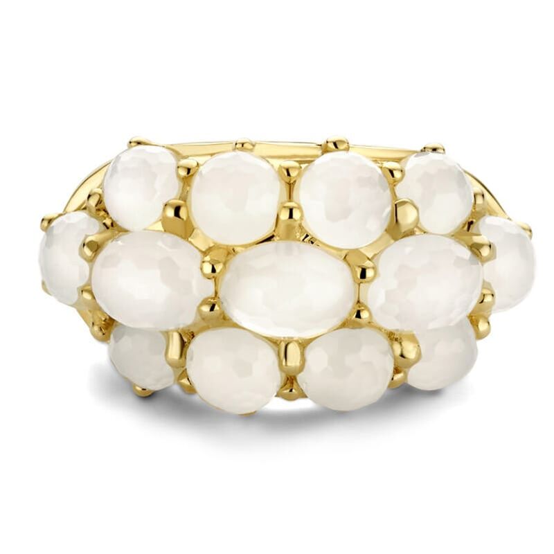 Een echt topjuweel: deze 14 karaat geelgouden ring uit de Zilver.nl Home Collection is rijk bezet met facet geslepen witte maanstenen en wordt nieuw geleverd in luxe geschenkverpakking.