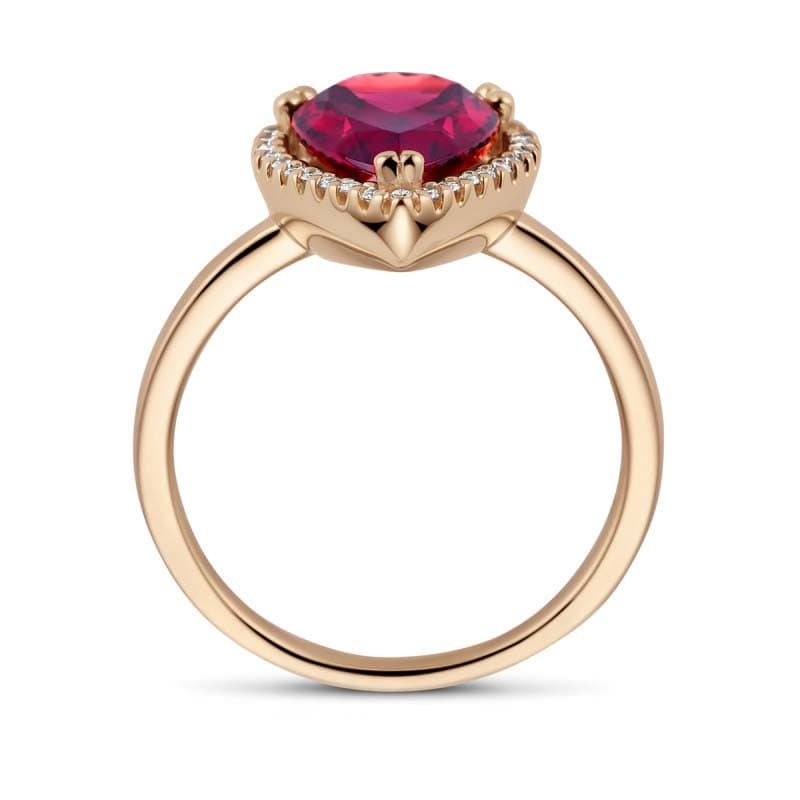 Deze 14 karaat roségouden ring heeft een druppelvormige rhodoliet van 12 x 9 mm als middelpunt. De kop van de ring meet 15 x 12 mm, waardoor de steen mooi aanwezig is zonder te overheersen.