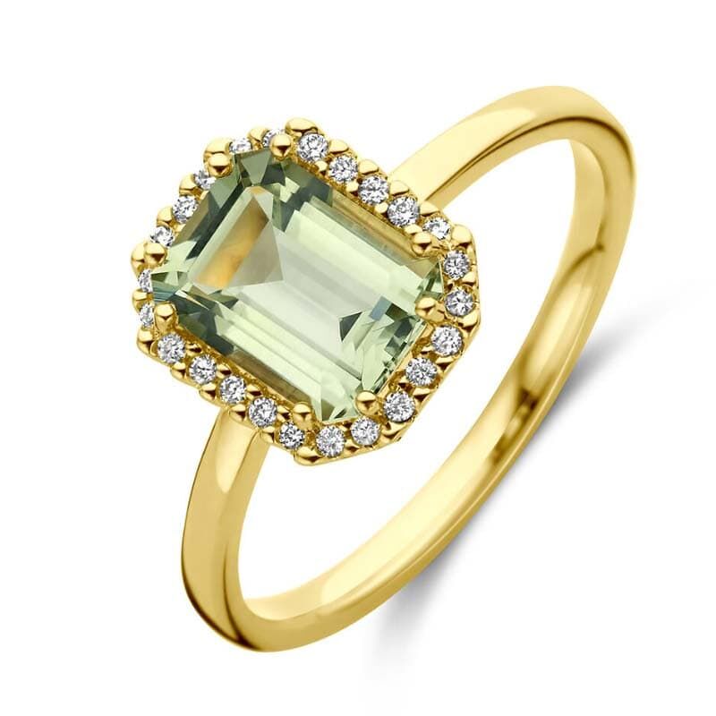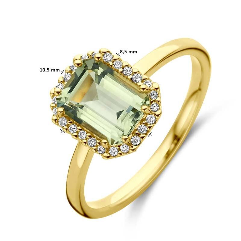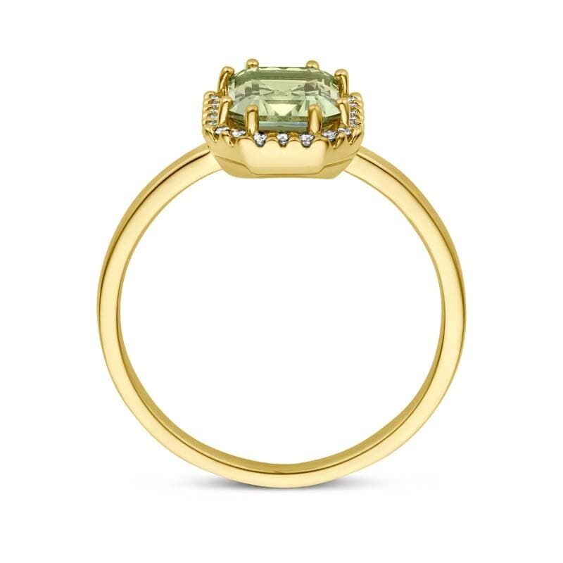 Deze 18k geelgouden ring is uitgevoerd met een groene amethist en diamanten. De ring is 10,5 mm breed en heeft een gepolijste afwerking voor een mooie, gladde glans. De groene amethist is emerald geslepen en heeft een steenmaat van 8 mm hoog en 6 mm breed, waardoor de kleur en lijnen extra goed uitkomen.
