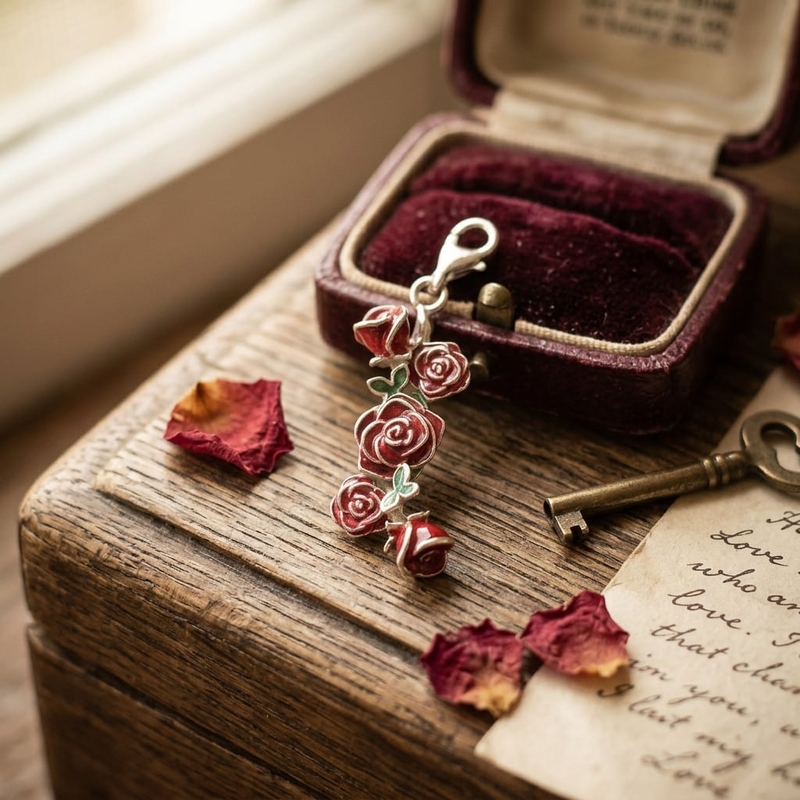 De zilversmeden van Saturno in Italië tonen hun meesterschap door het gebruik van emaille, een techniek waarbij gekleurd glaspoeder op het zilver wordt gesmolten. Dit resulteert in de intense, blijvende kleuren van de rozen en de bladeren. Dankzij het handige click-on hangoog kunt u de bedel heel eenvoudig bevestigen en wisselen tussen verschillende colliers of armbanden.