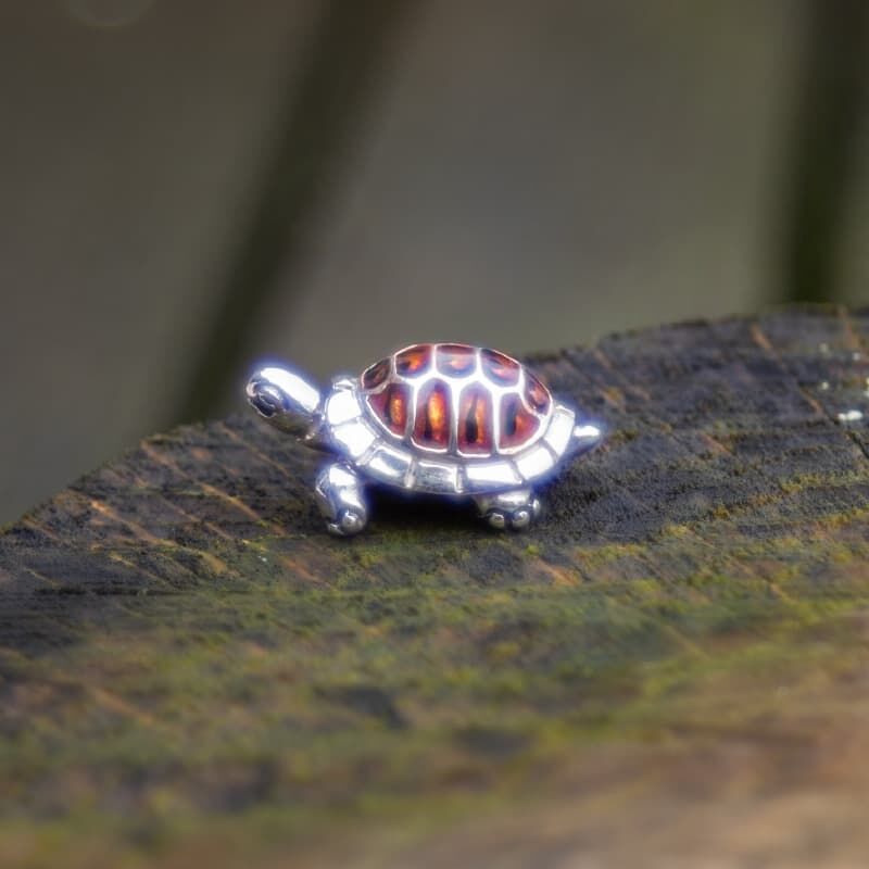 Kleine miniatuur zilveren schildpad met emaille gemaakt door de zilversmeden van Saturno te Italie, nieuw in geschenkverpakking. Lief klein schildpadje met licht en donkerblauw emaille. De 1e gehalte zilveren schildpad is 2,3 cm lang x 2,2 cm breed en 1 cm hoog, hij weegt 5.22 gram.