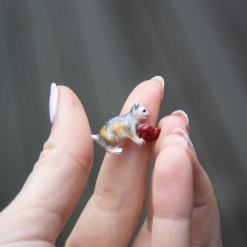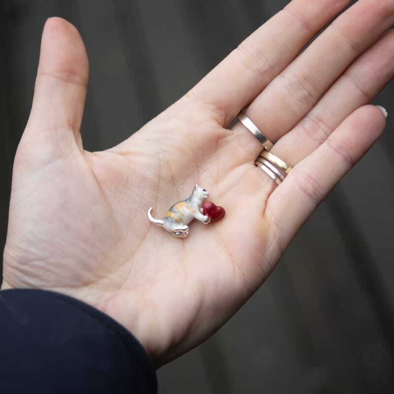 Kleine zilveren miniatuur voorstelling van een poes met een hartje gemaakt door Saturno te Italie, nieuw in geschenkverpakking. Lieve kleine kitten met een hartje gemaakt van 1e gehalte zilver met bijzonder mooi emaille. Het miniatuurtje is 2,5 cm lang x 7 mm breed en 1,5 cm hoog en hij weegt 7.66 gram.