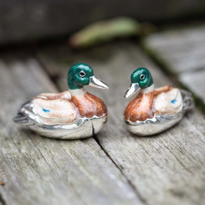 Zilveren tafelstukje / miniatuurtje in de vorm van een eend met emaille, Saturno nieuw in geschenkverpakking. Prachtige, stevige eend, 5,4 cm x 2 cm en 3,5 cm hoog, ±40 gram.