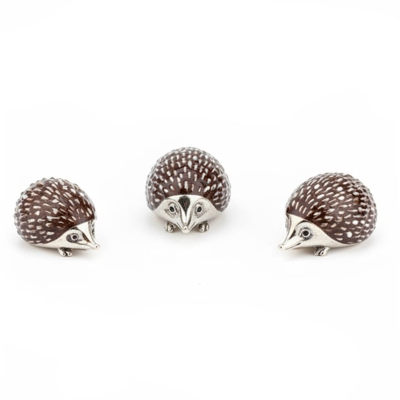 Miniatuur zilveren egeltje met emaille, gemaakt door Saturno in Italië en nieuw in een geschenkdoosje. Dit prachtige, massief 1e gehalte zilveren egeltje heeft een stekelvacht met van donkerbruin naar lichtbruin overlopend emaille, wat het diertje een warme en levendige uitstraling geeft. Het egeltje is 4,5 cm lang x 2,7 cm breed en 2,2 cm hoog en weegt 32 gram. (1)