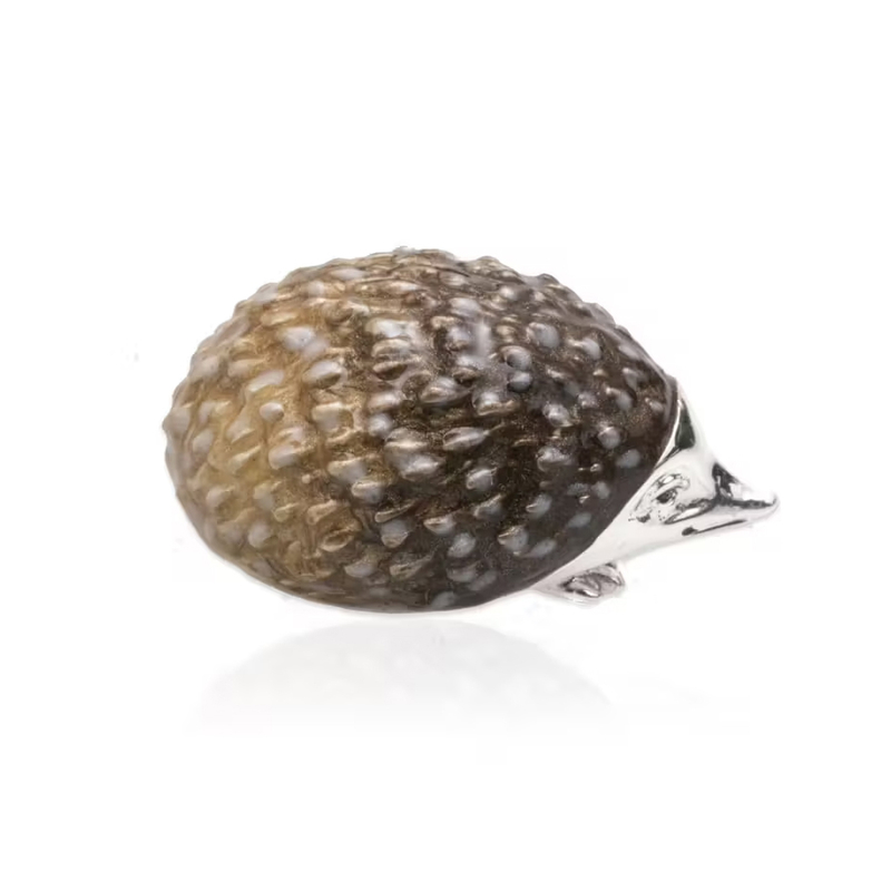 Miniatuur zilveren egeltje met emaille gemaakt door Saturno te Italie, nieuw in een geschenkdoosje. Klein, heel mooi 1e gehalte zilveren egeltje, het stekelvacht met van donkerbruin naar lichtbruin overlopend emaille. Het egeltje is 3 cm lang x 2,2 cm breed en 1,6 cm hoog 15,9 gram. Ieder stukje zilver van Saturno is uniek.