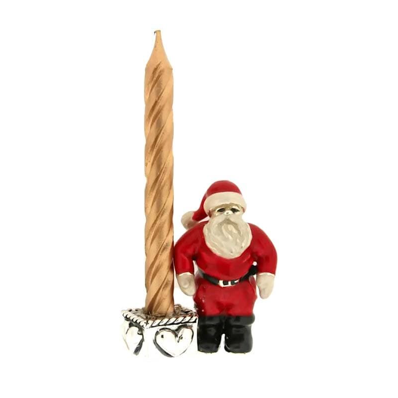 Zo leuk! Zilveren kerstkandelaartje met de kerstman gemaakt door de zilversmeden van Saturno te Italie. Het 1e gehalte zilveren kandelaartje is 4,6 cm hoog en 3,5 cm breed en weegt 61 gram, het wordt geleverd met een getorst rood kaarsje. Leuke kerstman met zwart, wit en rood emaille, het kaarsje staat in een zilveren bakje met hartjes rondom. U ontvangt het kandelaartje in een geschenkdoosje met een Saturno zakje en certificaatje.