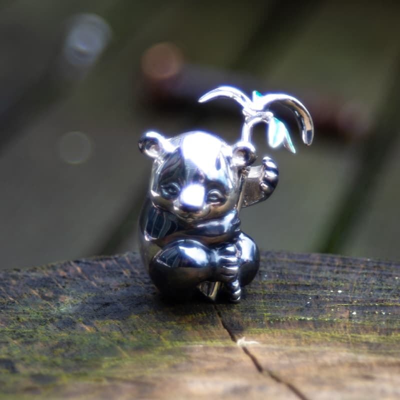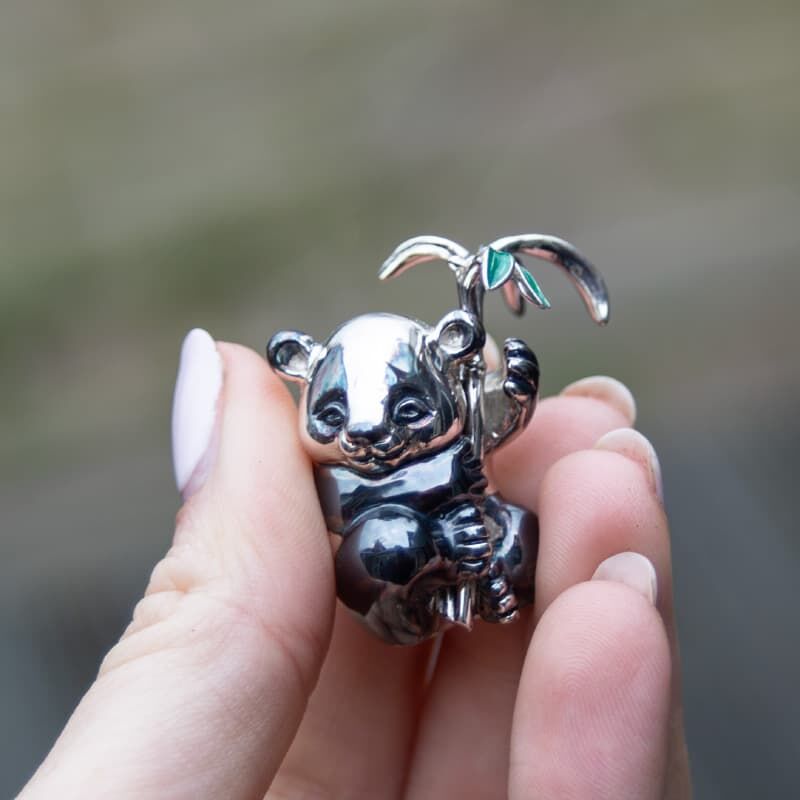 Zo leuk een miniatuur zilveren panda met emaille gemaakt door de zilversmeden van Saturno te Italie, nieuw in een geschenkdoos. Lieve 1e gehalte zilveren panda met een bamboetak met zwart en groen emaille. De pandabeer is 3,5 cm hoog en 1,8 x 2 cm en hij weegt 32 gram.