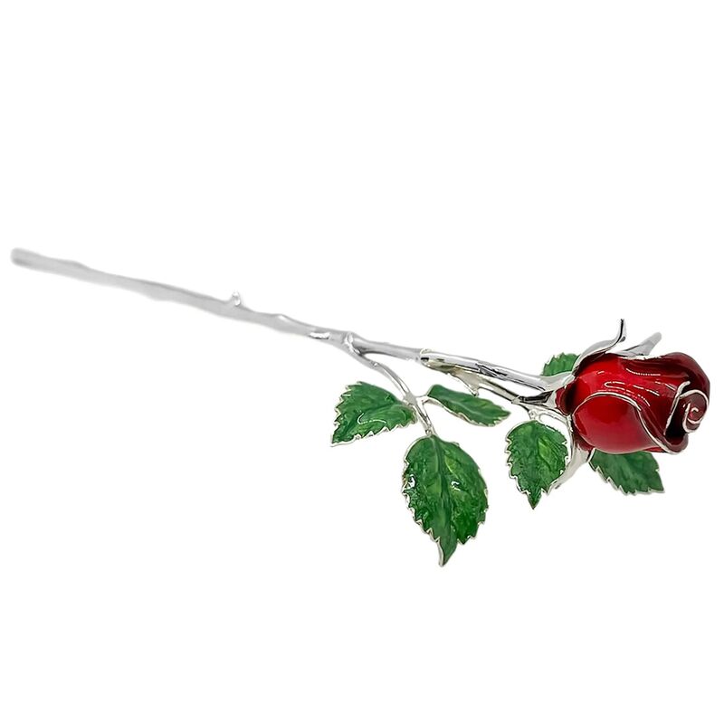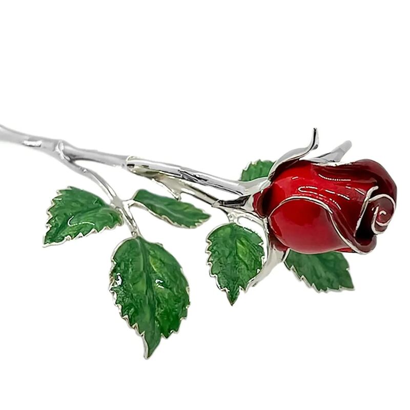 Deze verfijnde 1e gehalte zilveren roostak is vervaardigd door de ambachtslieden van Saturno in Italië. Het stuk wordt geleverd in een luxe geschenkdoos en is voorzien van zorgvuldig aangebrachte groene en rode emaille accenten. De takjes bestaan uit drie gedetailleerde blaadjes, daarboven een ontluikende bloemknop.
