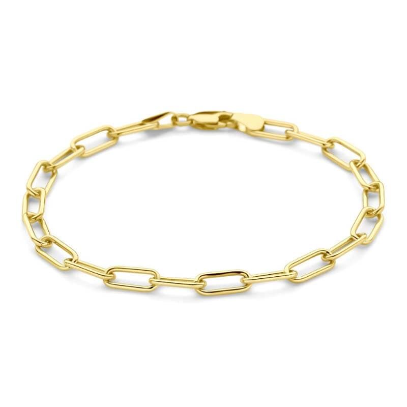 De armband is uitgevoerd met een anker schakeltype. De schakels hebben een breedte van 4,7 mm en zijn netjes gepolijst, wat zorgt voor een strakke, verzorgde glans die makkelijk te combineren is met andere sieraden of een horloge.