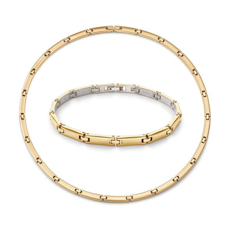 Titanium staat bekend om zijn huidvriendelijke eigenschappen. Het is allergeen neutraal, wat het materiaal bijzonder geschikt maakt voor mensen met een gevoelige huid. De vergulde afwerking geeft zowel het collier als de armband in deze set een warme uitstraling zonder in te leveren op draagcomfort of duurzaamheid.