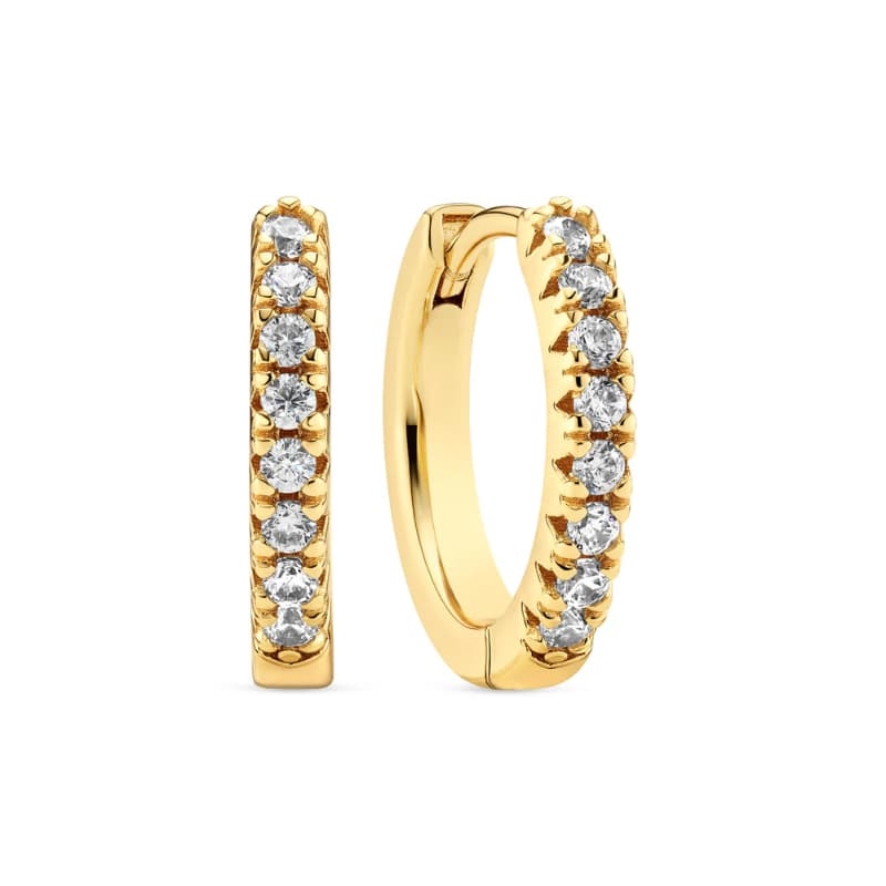 De vaste rij stenen is netjes in het ontwerp opgenomen, zodat de voorkant een gelijkmatig fonkelend accent krijgt. De 18k vergulding geeft het zilver een warme toon en zorgt voor een verzorgde, luxe uitstraling.