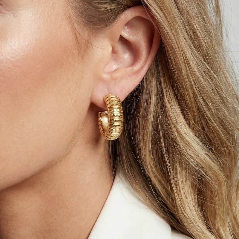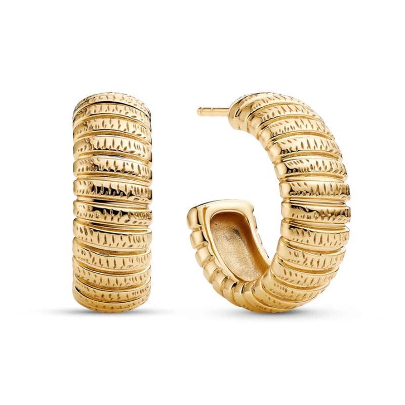 Het reliëf loopt rondom door en geeft de creolen een rijk gevoel van diepte en ritme. De rhodium laag helpt de vergulde kleur fris te houden en sluit prettig aan bij de strakke vorm en de nette steeksluiting. Stevige, mooi gemaakte steekcreolen.
