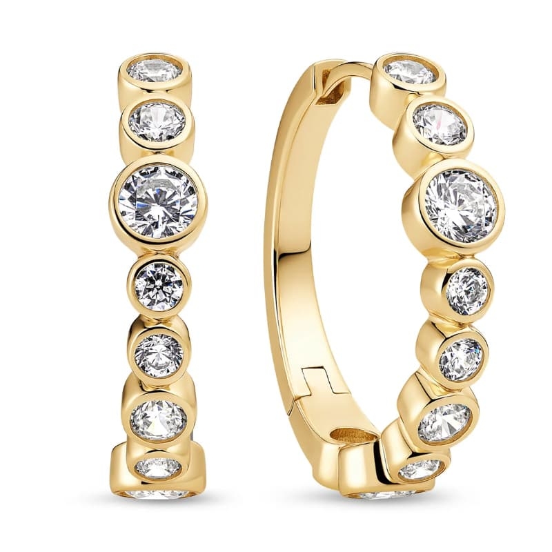 De voorkant van de creolen is bezet met een rij facetgeslepen witte zirkonia in verschillende formaten, elk geplaatst in een elegante chaton- of bezelzetting. Deze zetting geeft de stenen een moderne, strakke uitstraling en laat het licht prachtig weerkaatsen. Het subtiele spel van grotere en kleinere stenen zorgt voor een levendig en sprankelend effect.