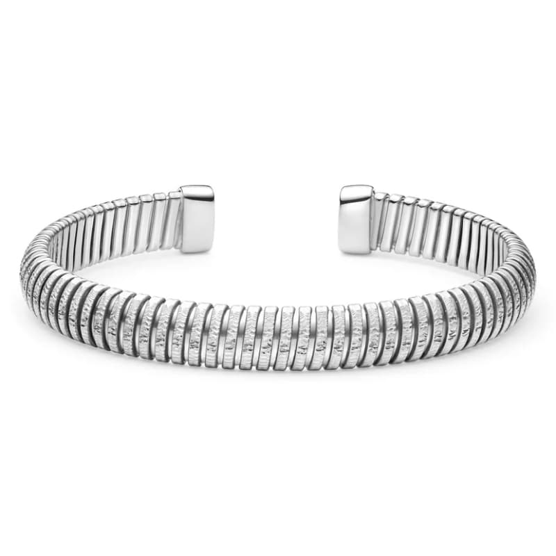Met haar karakteristieke, geribbelde vorm buigt de Riva tubogas bangle soepel om de pols. Deze armband is gemaakt van 1e gehalte zilver en gerhodineerd afgewerkt voor een heldere, koele glans. Het ontwerp is licht stretchend en draagt daardoor prettig; de binnendiameter is 47 x 61 mm en de band is 8 mm breed. Nieuw geleverd in geschenkverpakking.