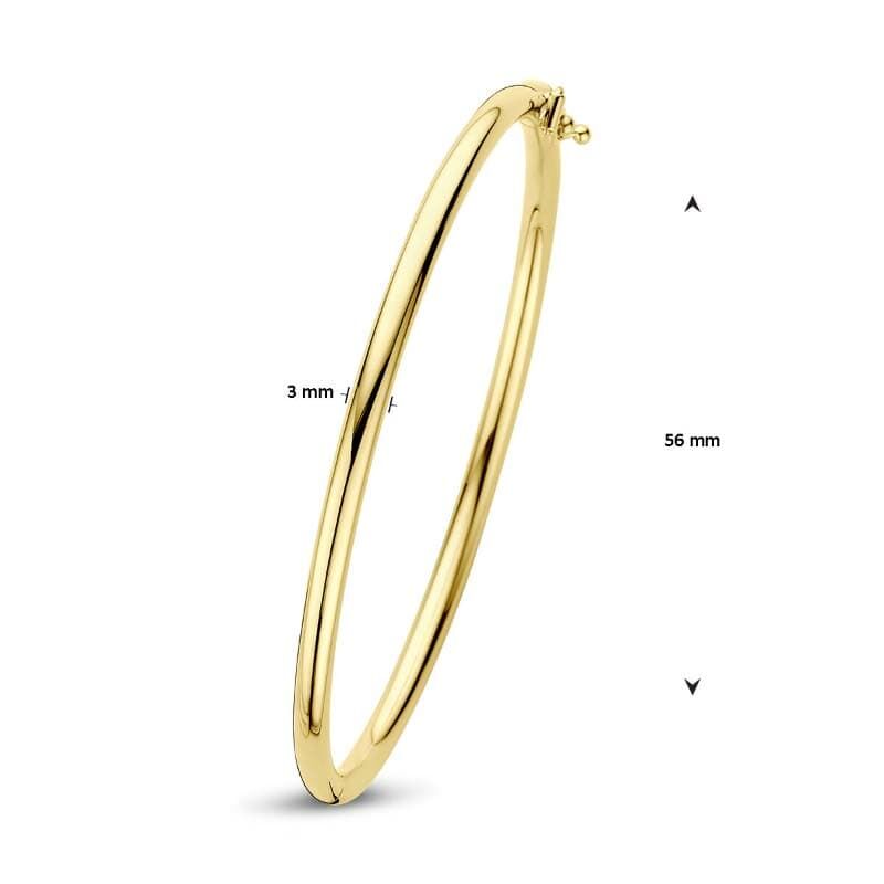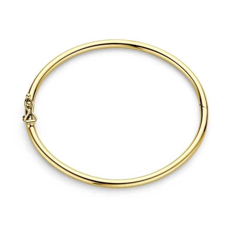 Deze stijlvolle 14 karaat geelgouden bangle is vervaardigd met een ronde buis van 3 mm breed en straalt tijdloze klasse uit. De armband is uitgevoerd met een scharnier, wat het om- en afdoen gemakkelijk maakt.