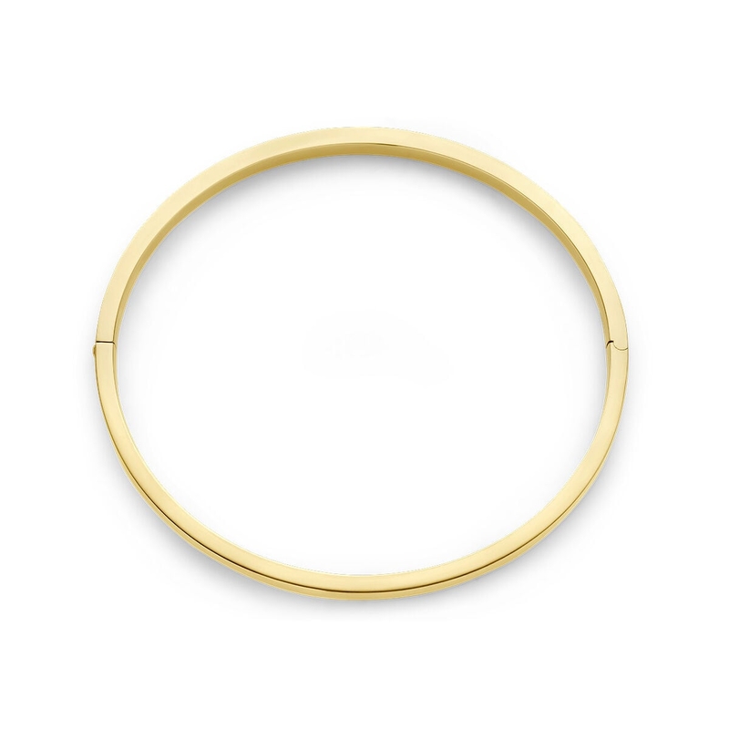 Deze geelgouden bangle heeft een praktische scharnier-sluiting, zodat je hem eenvoudig om en af doet, zonder over je hand te schuiven.