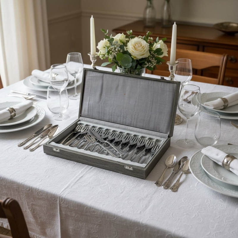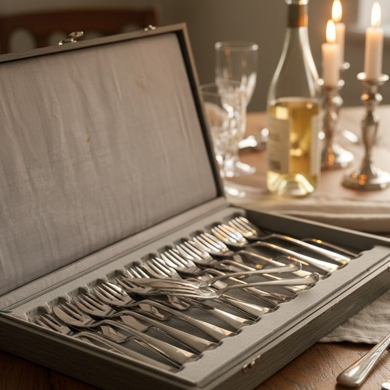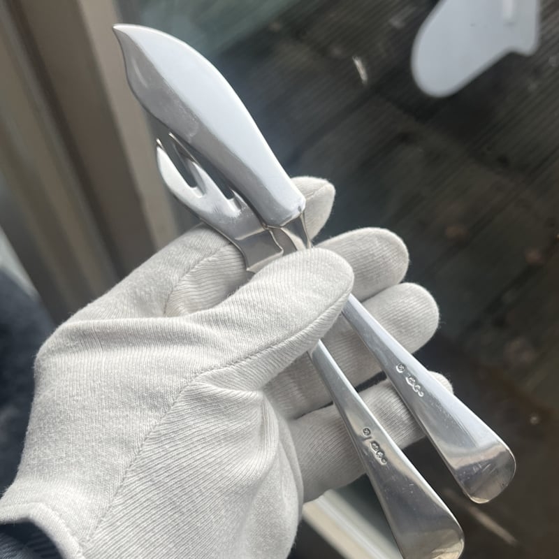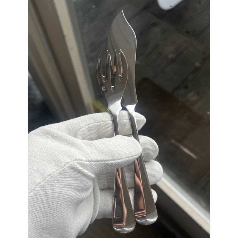 De zilveren vismessen zijn 20,4 cm lang en de visvorken zijn 16,9 cm lang, ze wegen samen maar liefst 1200 gram. (24 stuks). De viscouverts zitten samen in het niet originele etui van juwelierL.J. Wolf & Zoon Kalverstraat 196-198 te Amsterdam.