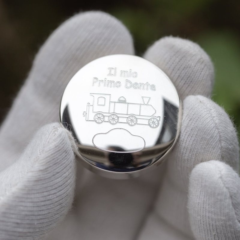 Stoer zilveren tandendoosje "il mio Primo Dente", mijn eerste tandje in het Italiaans, met een afbeelding van een trein gemaakt door de zilversmeden van Zaramella Argenti te Italie, nieuw in een geschenkdoosje. 1e Gehalte rond zilveren doosje met op de deksel een gegraveerde afbeelding van een trein, de tekst 'il mio Primo Dente' en een vakje om een naam in te graveren. De diameter van het zilveren doosje is 3,5 x 1 m hoog en het weegt 12,70 gram.