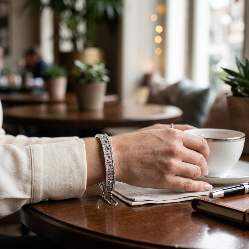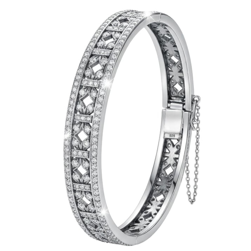 Het zilver is met grote precisie opengewerkt in een geometrisch motief, wat de armband een luchtig karakter geeft ondanks de rijke bezetting. Dankzij het stevige scharnier opent het sieraad moeiteloos, terwijl het subtiele veiligheidskettinkje extra zekerheid biedt tijdens het dragen. Elk detail getuigt van aandacht voor duurzaamheid en een verfijnde afwerking.