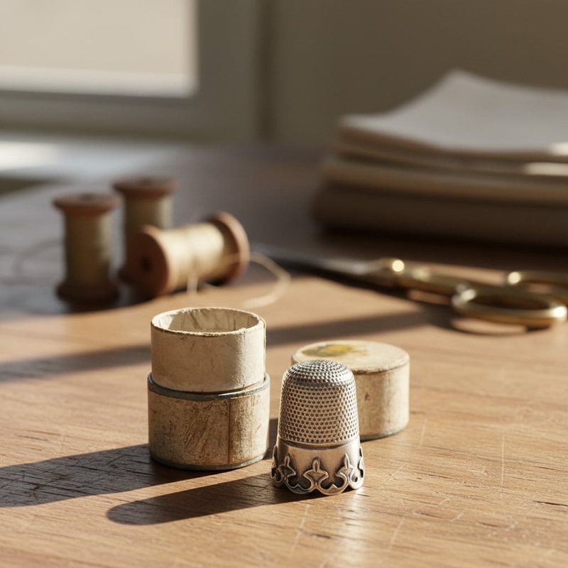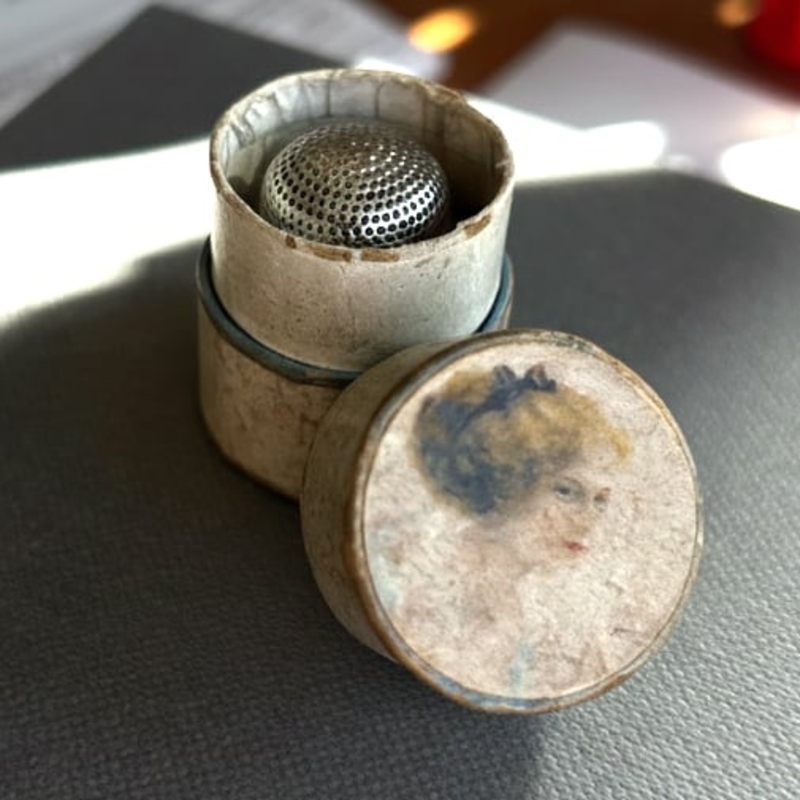 De vingerhoed zit in een antiek kartonnen doosje een zogenaamde 'dé à coudre box' met op de deksel het portret van een elegante dame waarschijnlijk gemaakt in Frankrijk rond 1890-1910.