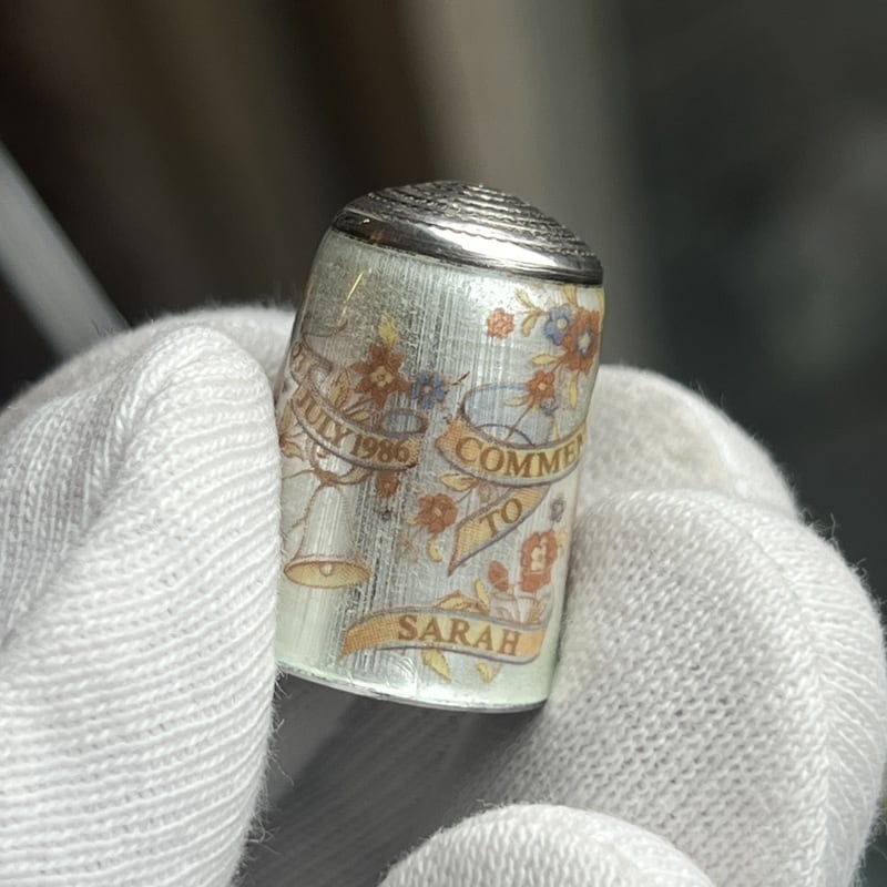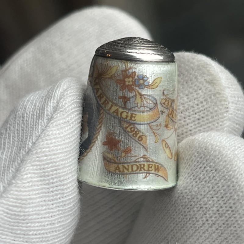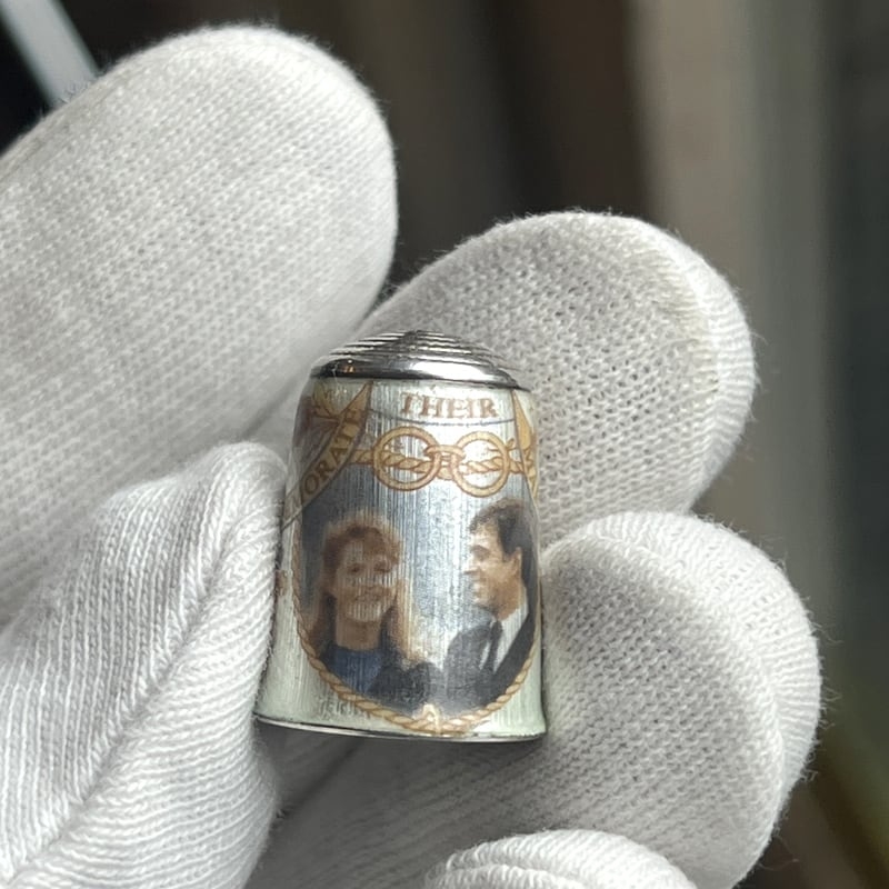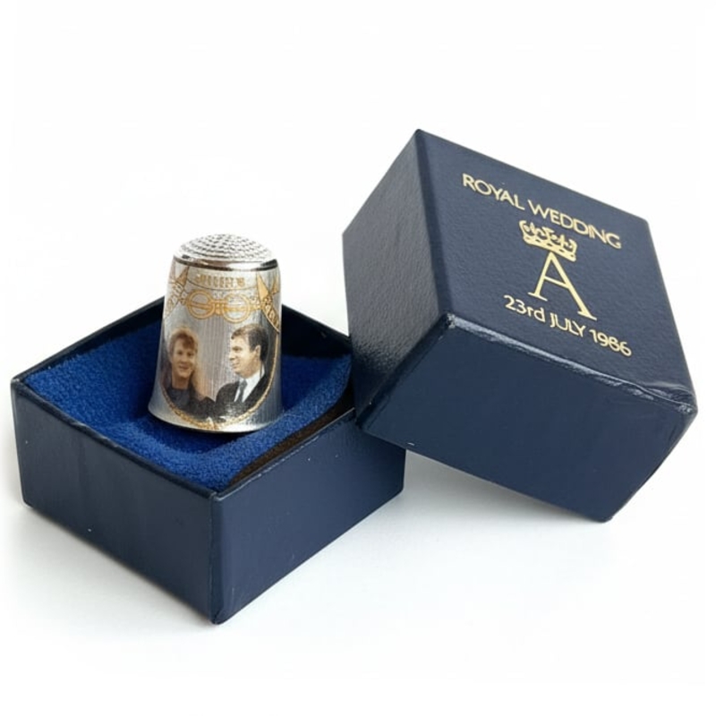 Deze bijzondere zilveren vingerhoed werd vervaardigd ter gelegenheid van het huwelijk van prins Andrew, hertog van York, en Sarah Ferguson op 23 juli 1986 — één van de meest besproken koninklijke huwelijken van de jaren tachtig.