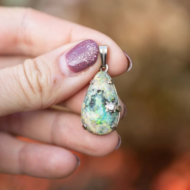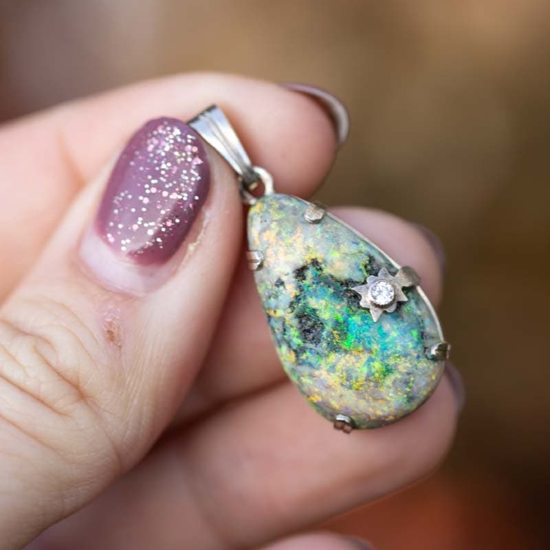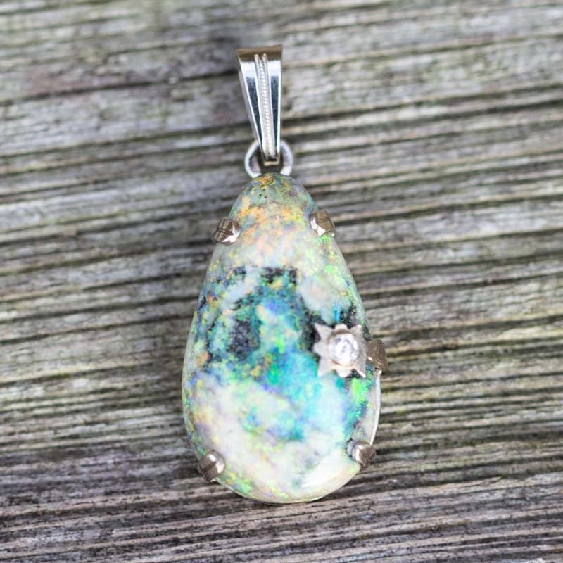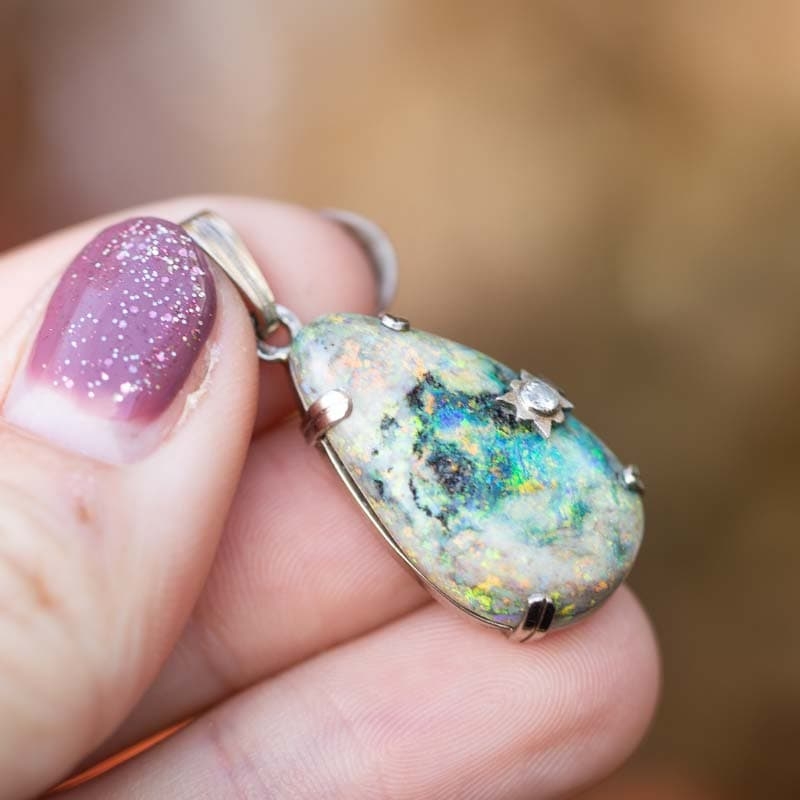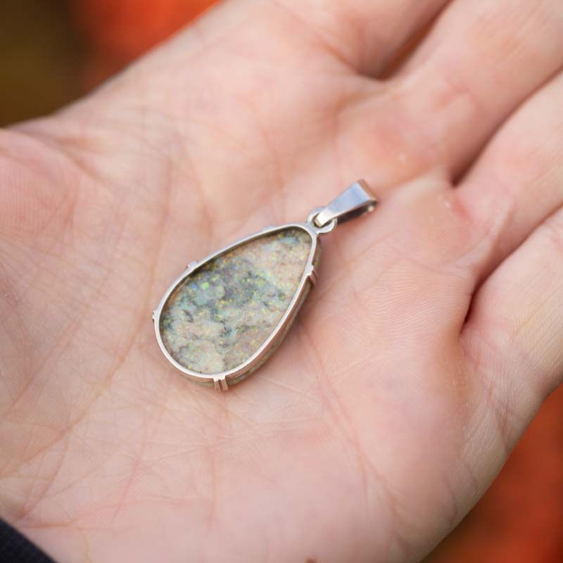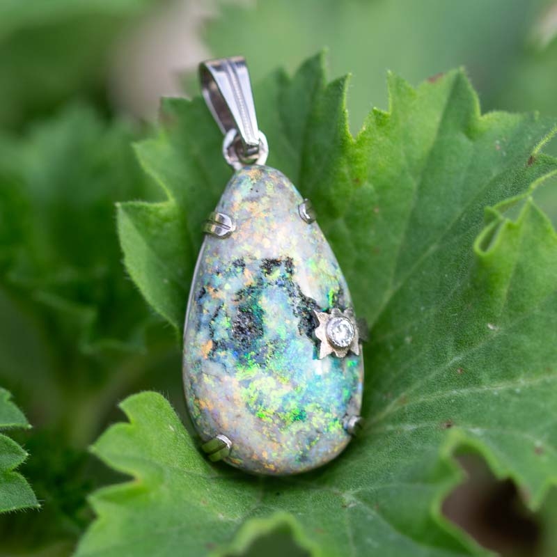 Het levendige spel van groene, rode, oranje en blauw tinten ontstaat door de interne structuur van de opaal. Afhankelijk van het licht en de hoek waarin je kijkt, “springen” er steeds andere kleuren naar voren. Daardoor blijft de boulderopaal in deze hanger continu interessant en lijkt hij bijna te bewegen.