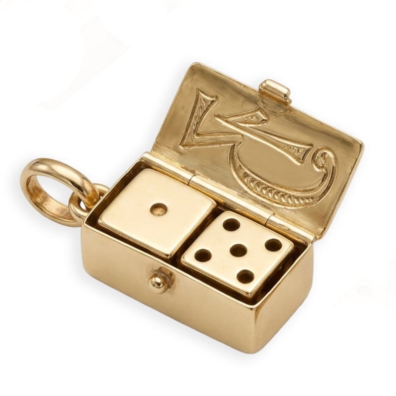 Wanneer het doosje wordt geopend, komen twee kleine gouden dobbelstenen tevoorschijn met donkere stippen die de ogen duidelijk markeren. Het doosje fungeert zo als een miniatuur opbergdoosje voor de dobbelstenen en maakt het geheel tot een speels en zeldzaam sieraad