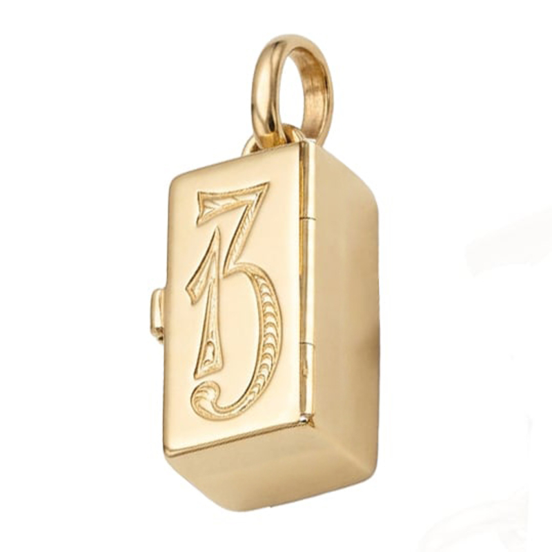 Deze bijzondere vintage 14 karaat gouden hanger is uitgevoerd als een klein doosje dat geopend kan worden. Op het deksel is het getal 13 gegraveerd in een sierlijk, art-deco stijl lettertype. Aan de bovenzijde bevindt zich een stevige draagring, waardoor het stuk gedragen kan worden als hanger aan een collier of horlogeketting.