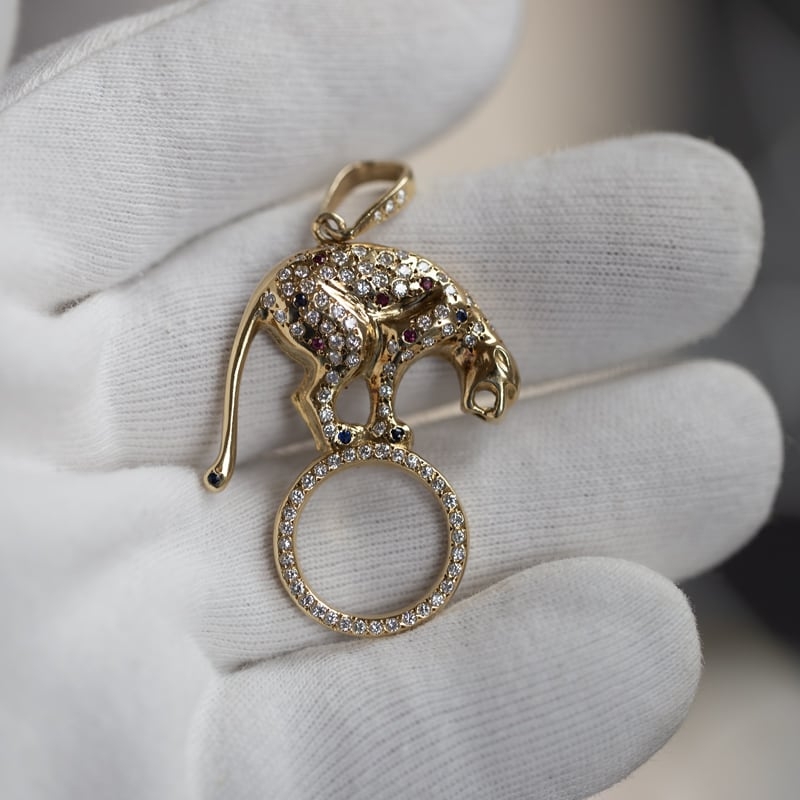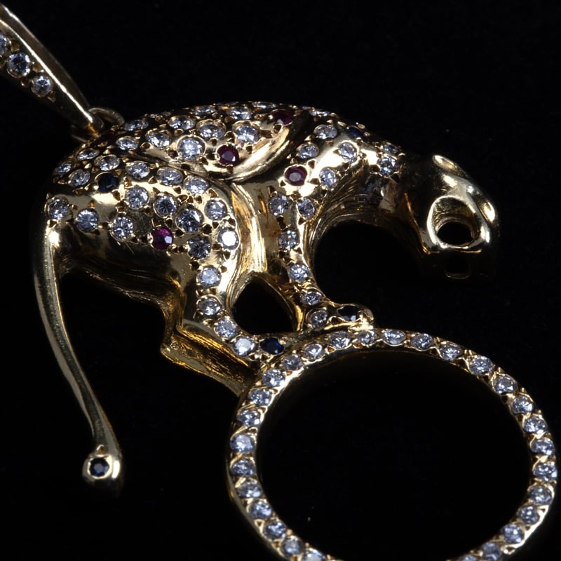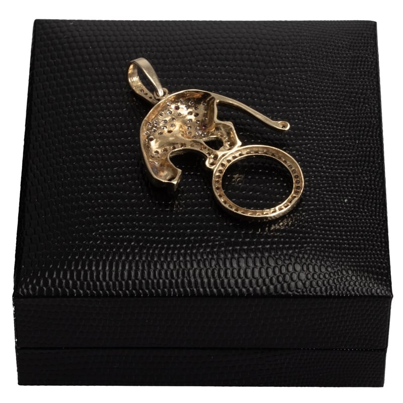 Deze indrukwekkende vintage hanger is een waar kunstwerk, vervaardigd uit hoogwaardig 18 karaat geelgoud en met een totaalgewicht van 12,8 gram. Het verfijnde ontwerp toont een sierlijke panter in volle glorie, staand op een open cirkelvormige bal die rijkelijk bezet is met fonkelende edelstenen.