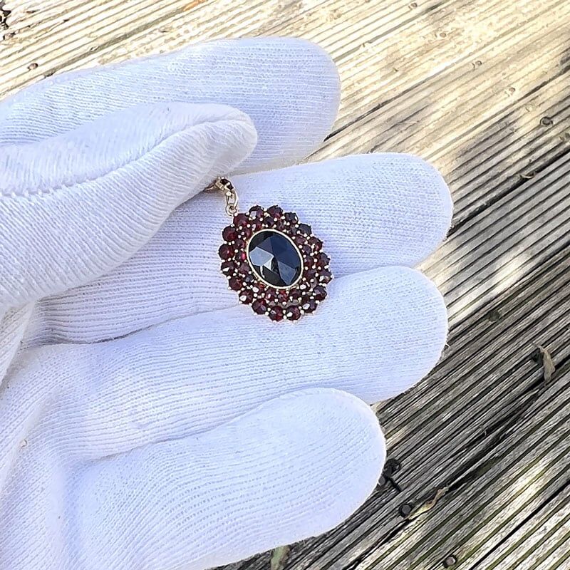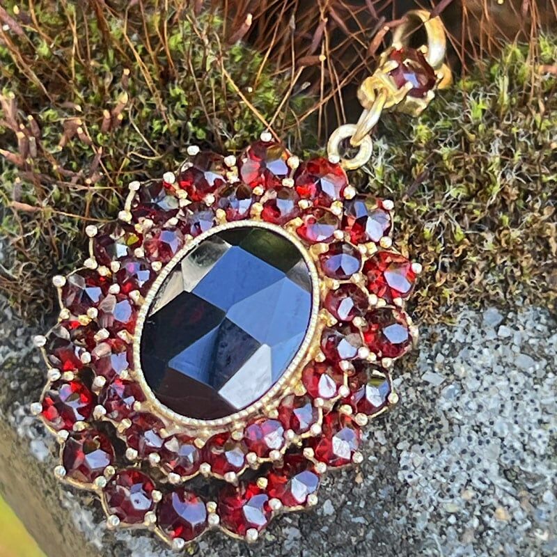 Deze prachtige vintage hanger is gemaakt van 14 karaat goud en volop bezet met Boheems granaat in uitstekende staat.. Het is een opvallend sieraad dat meteen de aandacht trekt. De hanger heeft een klassieke, vintage uitstraling die nooit uit de mode raakt. Hij is perfect voor speciale gelegenheden of gewoon om elke dag te dragen als blikvanger bij je outfit. De gouden hanger is 3,5 cm lang x 1,9 cm breed en weegt 2.6 gram.