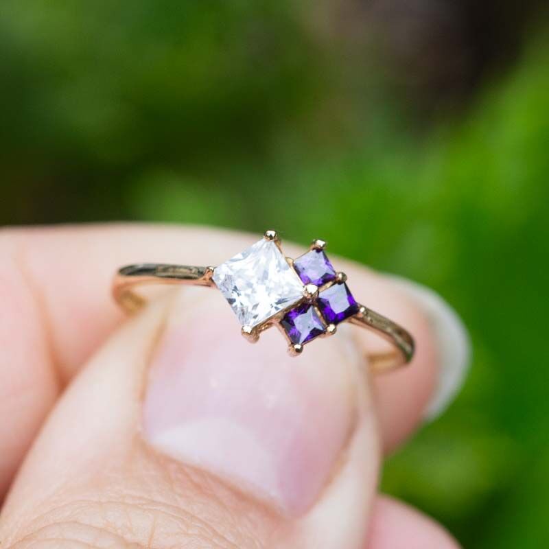 In het midden zit een ruitvormige witte zirkonia die helder opvalt. Aan één kant zijn drie kleinere paarse zirkonia’s geplaatst, wat zorgt voor een subtiel kleuraccent.SEO: Subtiele vintage 14krt gouden ring met witte en paarse zirkonia's – elegantie en liefde gevangen in één uniek sieraad.