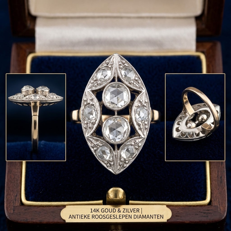Deze elegante vintage ring is uitgevoerd in 14 karaat goud met een verfijnde witgouden bovenzijde waarin meerdere diamanten zijn gezet. Het ringhoofd heeft een sierlijke marquise- of navettevorm, een vorm die al sinds het einde van de 19e eeuw geliefd is omdat hij de vinger optisch langer en slanker laat lijken. In het midden schittert een grotere diamant, omringd door vier kleinere stenen die samen een bloemachtig patroon vormen. De diamanten zijn roosgeslepen, een klassieke slijpvorm met een vlakke onderzijde en een koepelvormige bovenzijde met driehoekige facetten. Hierdoor geven ze een zachte, levendige glans die prachtig past bij vintage juwelen.