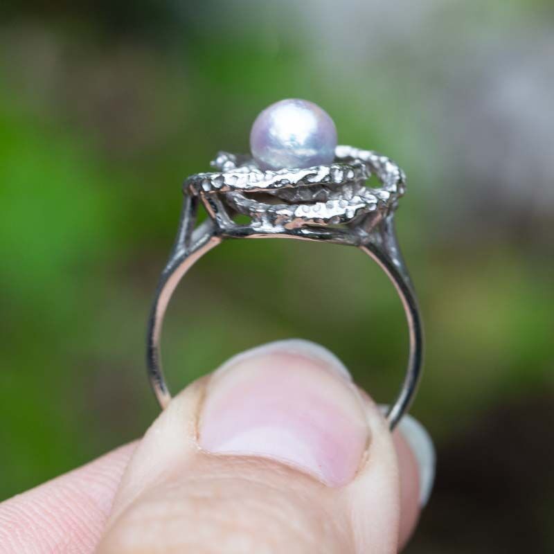 In het midden van de gevlochten cirkels zit een mooie grijze zoetwaterparel. Deze parel geeft de ring een chique en luxe uitstraling. De combinatie van het glanzende witgoud en de zachte glans van de parel maakt deze ring extra bijzonder.