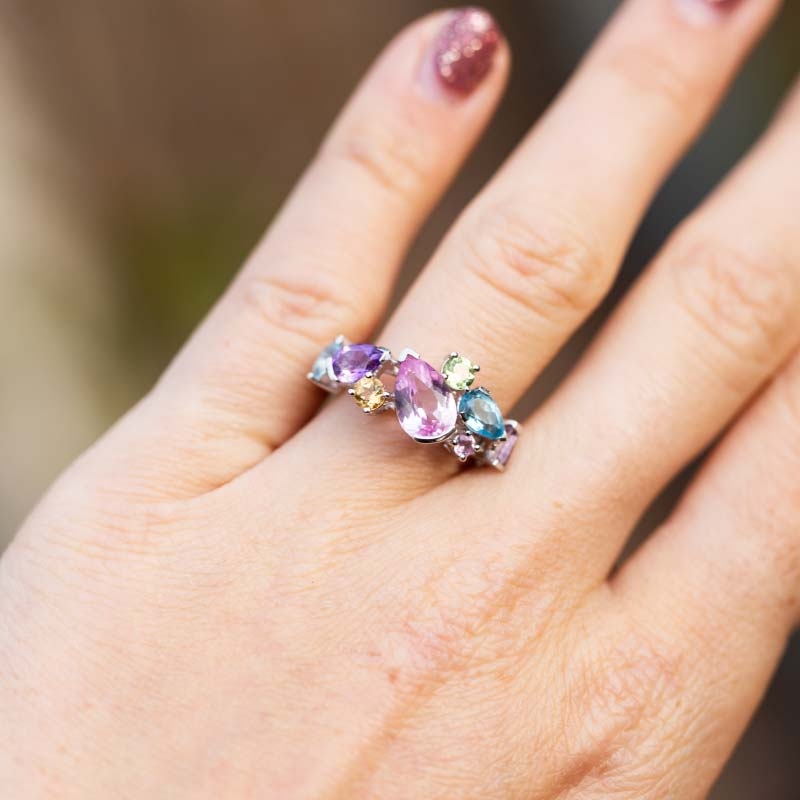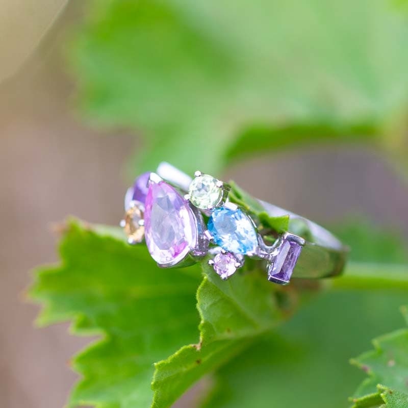 De ring is bezet met verschillende edelstenen, waardoor je een speels en kleurrijk effect krijgt. Je vindt hierin amethist, topaas, citrien, peridot en roze saffier. Samen zorgen ze voor een levendige mix van kleuren die de ring extra bijzonder maakt.
