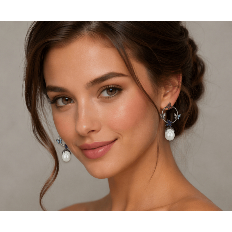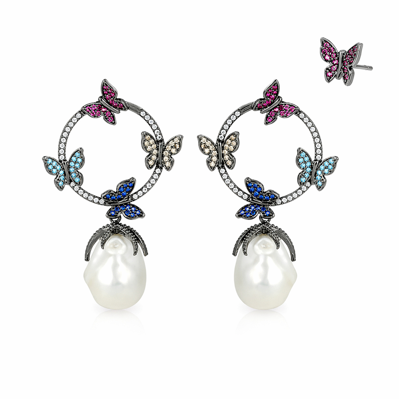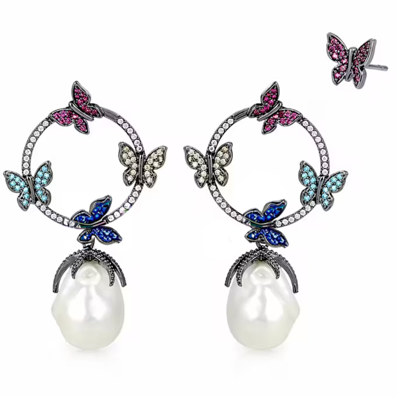 Deze gezwart eerste gehalte zilveren oorhangers bestaan uit een open cirkel met gekleurde vlinders en een grote barokke parel. De opengewerkte cirkel heeft een diameter van 2,3 cm en is bezet met witte zirkonia. Op de rand zijn vier vlinders geplaatst die elk zijn voorzien van zirkonia in kleuren zoals rood, blauw en champagne. De totale lengte van de oorbel bedraagt 4,6 cm. De bovenste rode vlinder met de steker kan uit de cirkel geschoven worden, waardoor deze ook los te dragen is.