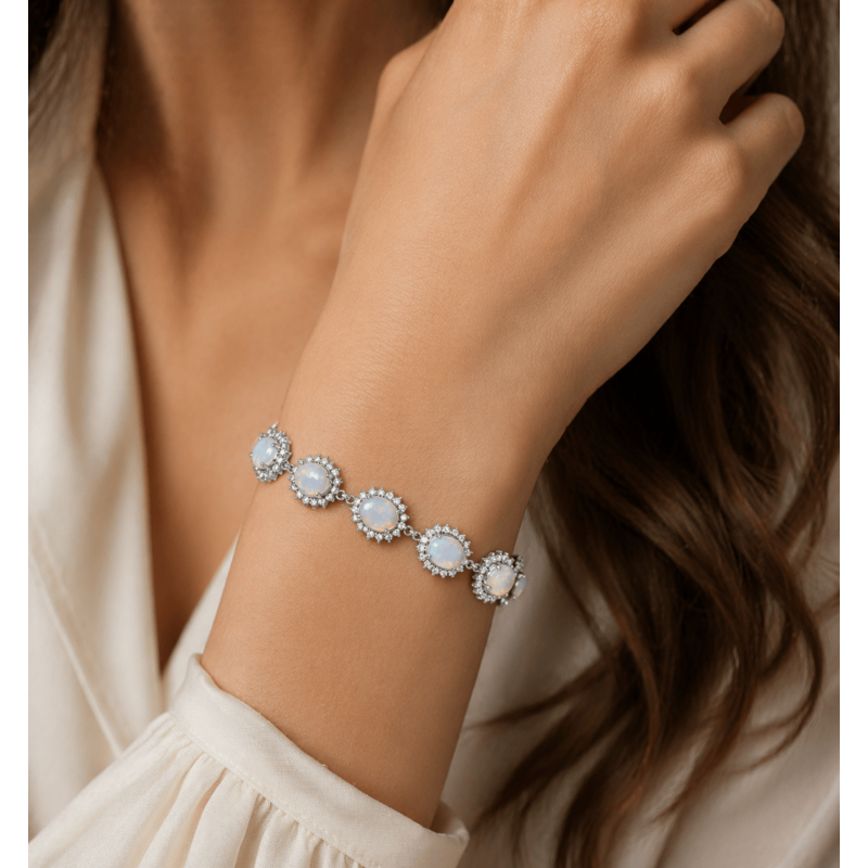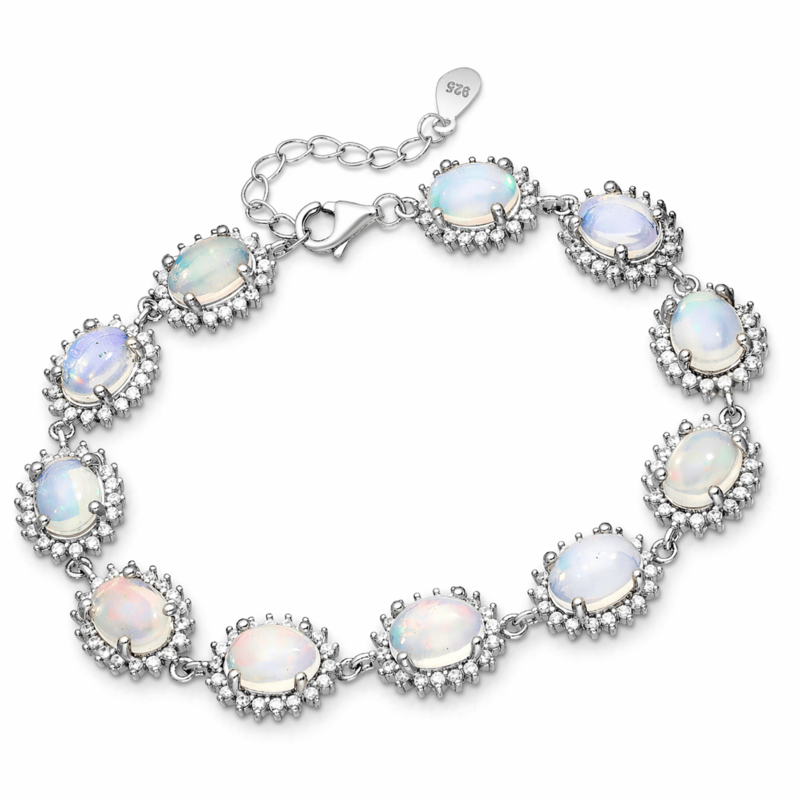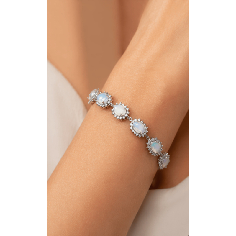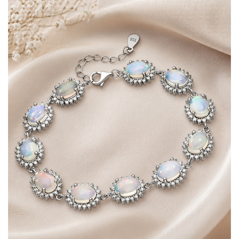 Deze schitterende 1e gehalte zilveren armband is een uniek sieraad dat elegantie en kleur op meesterlijke wijze combineert. De armband is bezet met 11 prachtig cabochon geslepen Ethiopische opalen, waarbij elke individuele steen luxueus wordt geaccentueerd door een fonkelende entourage van zirkonia. Dit nieuw vervaardigde sieraad wordt geleverd in een stijlvol geschenkdoosje, perfect als waardevol cadeau voor een bijzonder moment.