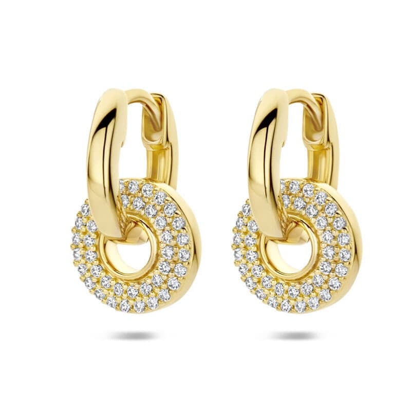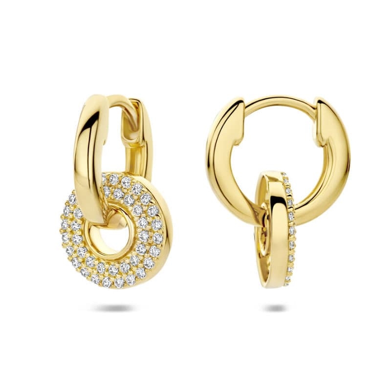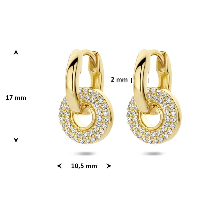De bedels aan deze oorbellen bevatten meerdere rijen zirkonia die over het volledige oppervlak van de ring zijn verdeeld. De creolen maken gebruik van een scharniersluiting die aan de achterzijde in de oorsteker klikt, wat zorgt voor een stevige bevestiging. De glanzende goudlaag over het zilver vormt een gelijkmatige basis voor de heldere stenen die nauwkeurig in het metaal zijn gevat.
