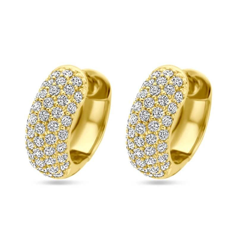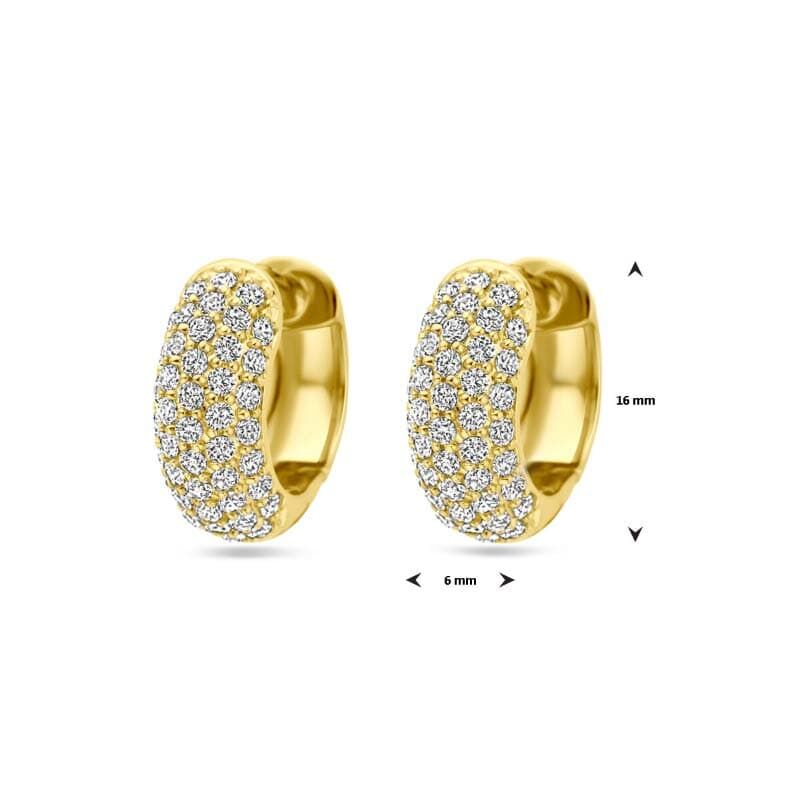De oorringen zijn rijkelijk bezet met pavé gezette zirkonia’s, zorgvuldig geplaatst om maximale lichtreflectie te garanderen. Deze steentjes zorgen voor een luxueuze uitstraling zonder concessies te doen aan draagcomfort of kwaliteit.
