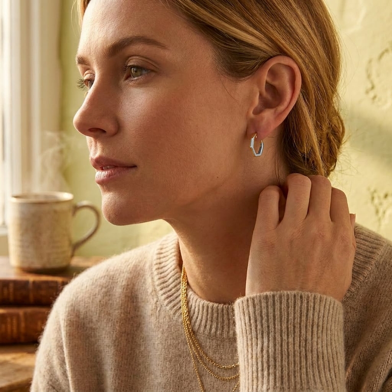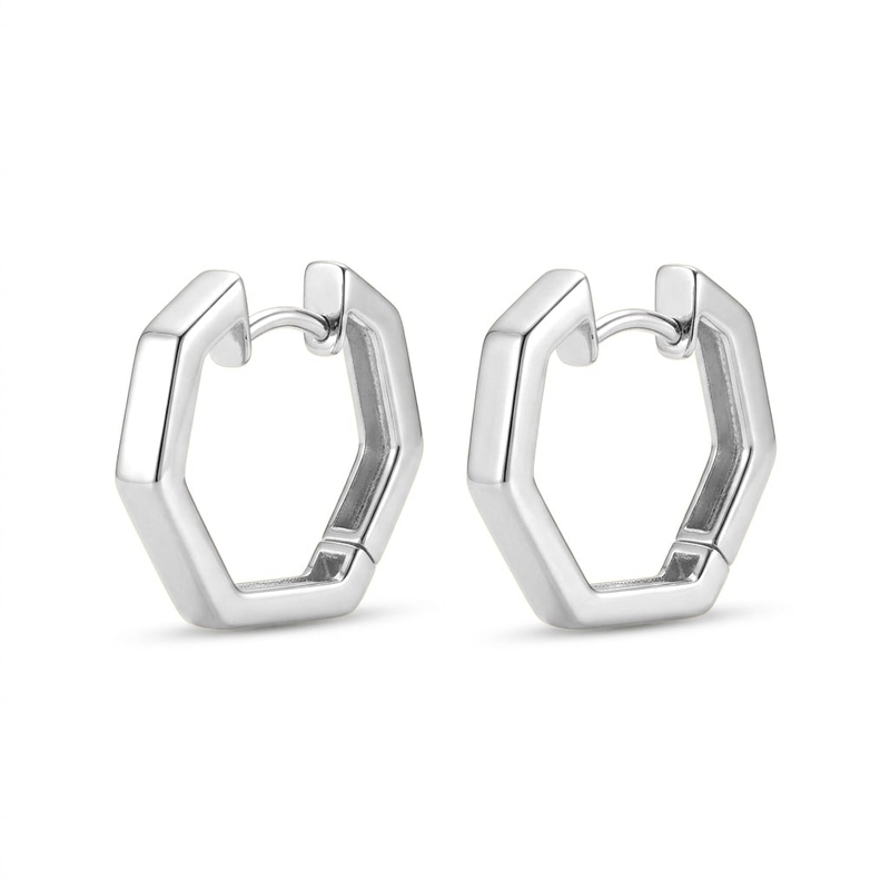 De zeskantige vorm is mooi strak gezet en de gladde, gepolijste vlakken laten het zilver rustig schitteren bij elke beweging. Door de klapconstructie sluiten de creolen netjes rondom het oor, waardoor de lijnen van het ontwerp mooi doorlopen.