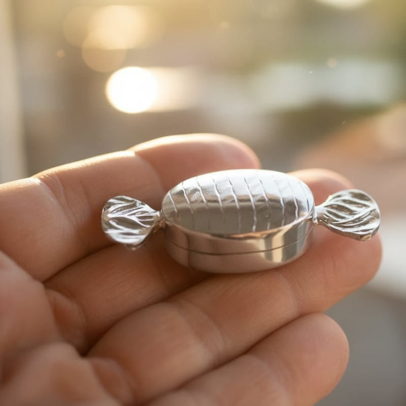 Ovaal zilveren 'snoepje' doosje uit de Home Collectie, nieuw geleverd in geschenkverpakking. Het betreft een stevig en leuk doosje met scharnier die eenvoudig opent door de uiteinde van het doosje contra te draaien. Het snoepje is op beide deksels gegraveerd met een gestreept en gematteerd patroon. Het 1e gehalte zilveren doosje is 3,3 x 2,2 cm en 1,2 cm hoog en het weegt 16 gram.