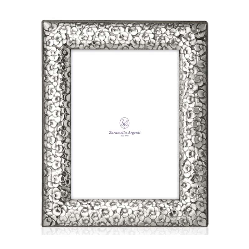 Zaramella zilveren fotolijst Firenze met bloemenmontuur. Fantastische fotolijst met een montuur vol zilveren bloemen. Het zilveren montuur is maar liefst 3 cm breed. Deze vrolijke, originele fotolijst heeft een houten achterkant en de fotomaat is 15 x 10 cm. De fotolijst ontvangt u inclusief certificaat. Het is niet mogelijk om de fotolijst te graveren.
