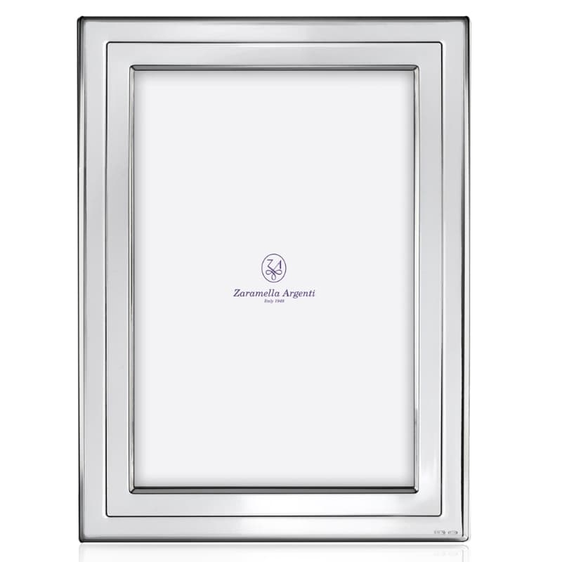 Zaramella 1e gehalte zilveren fotolijst model Kiel. Deze fotolijst heeft een zilveren montuur met in het midden rondom een randje. Het montuur is 18 mm breed. De fotolijst heeft een bruin houten achterkant. De fotomaat is 20 x 25 cm. U ontvangt de fotolijst in cadeauverpakking.
