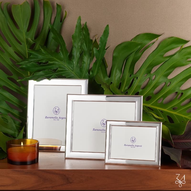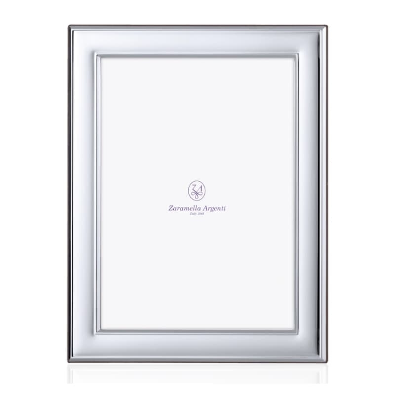 Zaramella 1e gehalte zilveren fotolijst model Kiev. Deze fotolijst heeft een glad zilveren montuur, het montuur is 18 mm breed. De fotolijst heeft een bruin houten achterkant. De fotomaat is 18 x 13 cm. U ontvangt de fotolijst in cadeauverpakking.