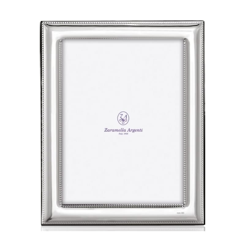 Zaramella zilveren fotolijst met een dubbele parelrand. Zowel rondom de foto als langs de buitenkant van de fotolijst loopt rondom een parelrand. Het montuur is 17 mm breed, de fotolijst heeft een bruin houten achterkant. De fotomaat van de fotolijst is 18 x 13cm. De fotolijst ontvangt u inclusief certificaat.