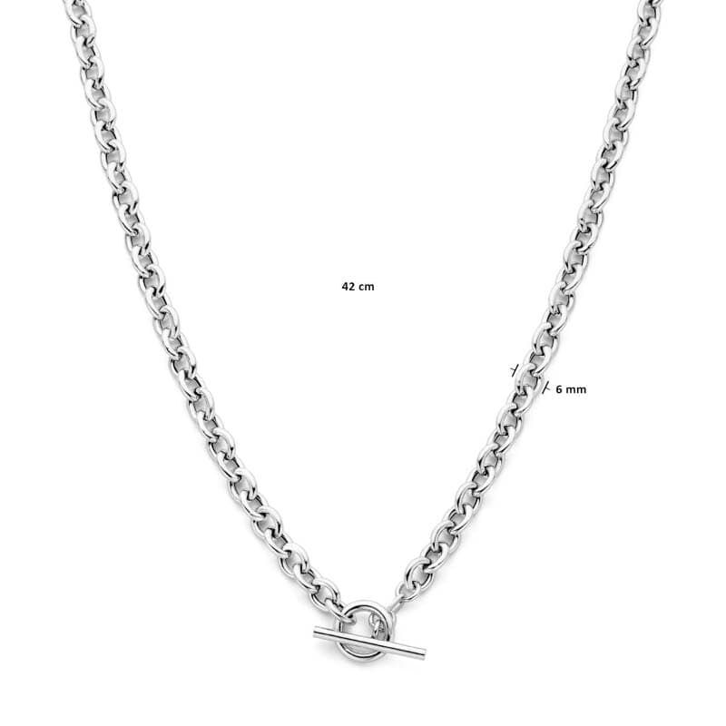 De ketting heeft een gepolijste afwerking die zorgt voor een strakke uitstraling. Dankzij de schakelbreedte van 6 mm komt het ontwerp goed tot zijn recht zonder overheersend te zijn. Het totale metaalgewicht bedraagt circa 11,7 gram, wat bijdraagt aan zowel stevigheid als draagcomfort.