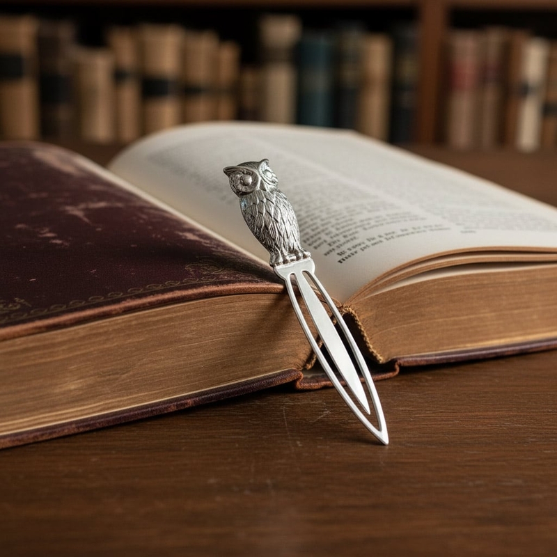 Grote 1e gehalte zilveren bladwijzer bekroond door een uil, nieuw in geschenkverpakking. Stevige zilveren bladwijzer met een grote bolle wijze uil die aan beide zijden bewerkt is. De bladwijzer is 9,2 cm lang x 1,6 cm breed en hij weegt 9 gram.